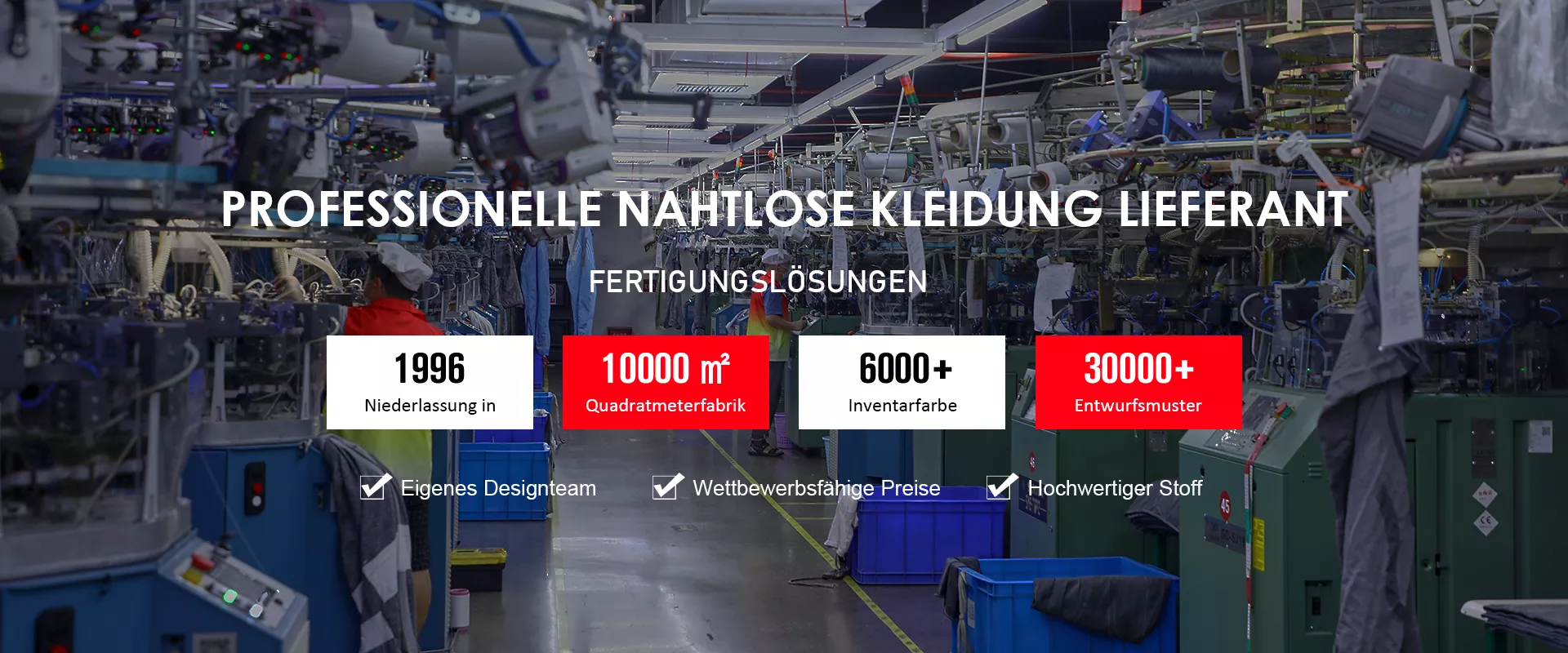 Unsere Firma konzentriert sich auf die Herstellung nahtloser Kleidungsserien, einschließlich nahtloser Unterwäsche, Yogakleidung, Sportbekleidung, Skibekleidung, Fahrradbekleidung, Shapewear, etc. Die Kernmitglieder des Unternehmens haben über 20-jährige Erfahrung in der nahtlosen Industrie und bieten Kunden umfassende professionelle Dienstleistungen einschließlich Forschung und Entwicklung, Weben, Färben, Nähen, Verpacken, Lagern, Transport und Vertrieb.